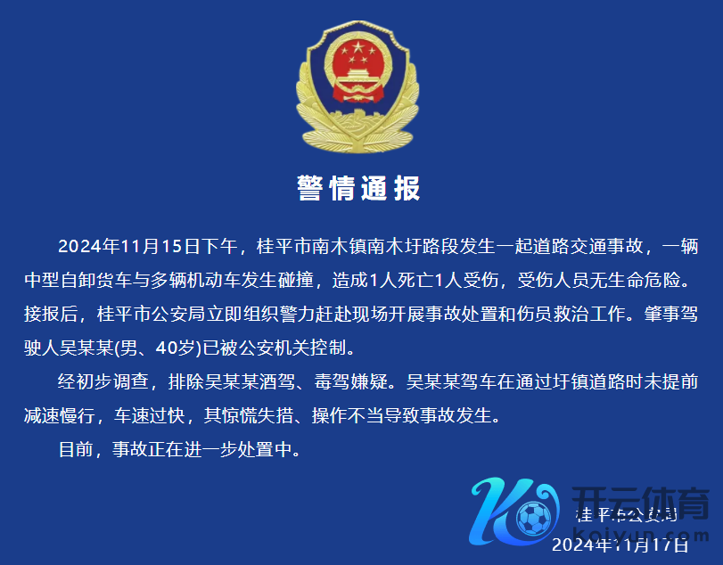 2024年11月15日下昼,桂平市南木镇南木圩路段发生一齐说念路交通事故,一辆中型自卸货车与多辆无邪车发生碰撞,变成1东说念主牺牲1东说念主受伤,受伤东说念主员无人命危急。接报后,桂平市公安局立即组织警力前去现场开展事故贬责和伤员救治责任。闯祸驾驶东说念主吴某某(男、40岁)已被公安机关截至。