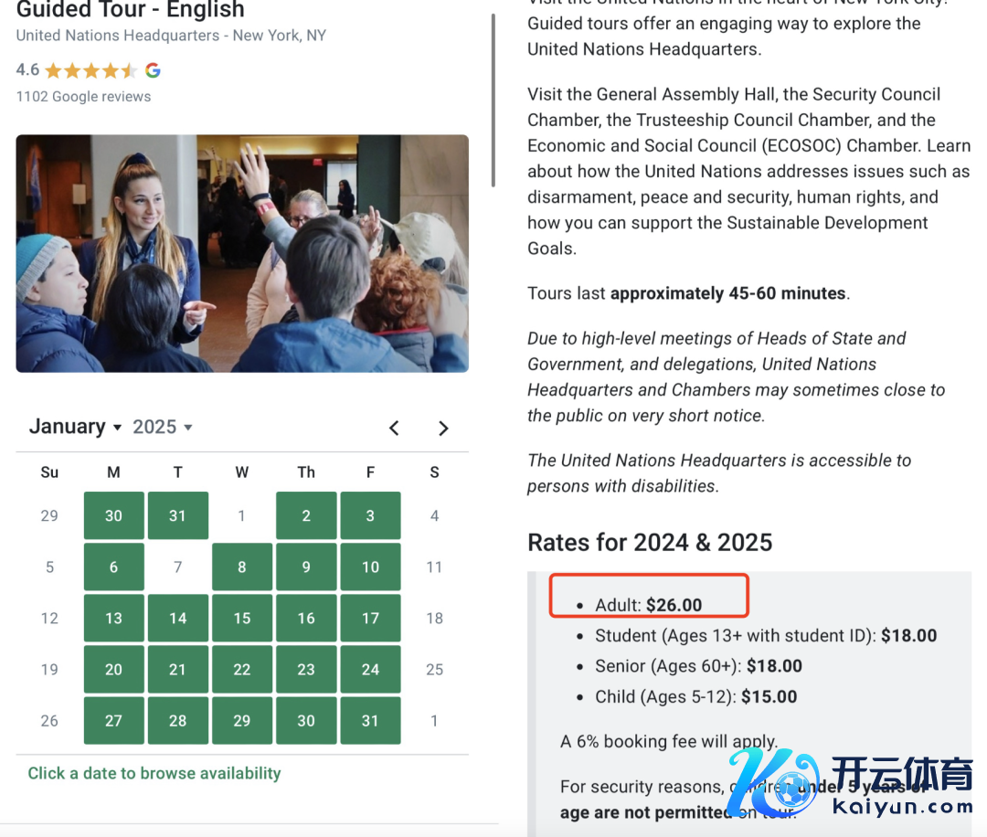 记者查询发现,连系国官网有着预约参不雅的进口,成东说念主价钱为26好意思元,13岁以上学生凭学生证支付18好意思金,5-12岁儿童支付15好意思金,60岁以上老东说念主支付18好意思金,现场还提供多国言语的导游劳动。酌量预约也曾到了2025年1月份。