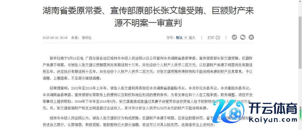 据新华社报说念kaiyun官方网站,2018年8月16日,广西壮族自治区桂林市中级东说念主民法院公开宣判中共湖南省委原常委、宣传部原部长张文雄纳贿、多数财产开始不解案,对被告东说念认识文雄以纳贿罪判处有期徒刑十三年,并处充公个东说念主财产东说念主民币二百万元,以多数财产开始不解罪判处有期徒刑五年,决定践诺有期徒刑十五年,并处充公个东说念主财产东说念主民币二百万元;对张文雄纳贿所得财物和不成证明开始的财产偏执孳息,给予追缴,上缴国库,不及部分络续追缴。