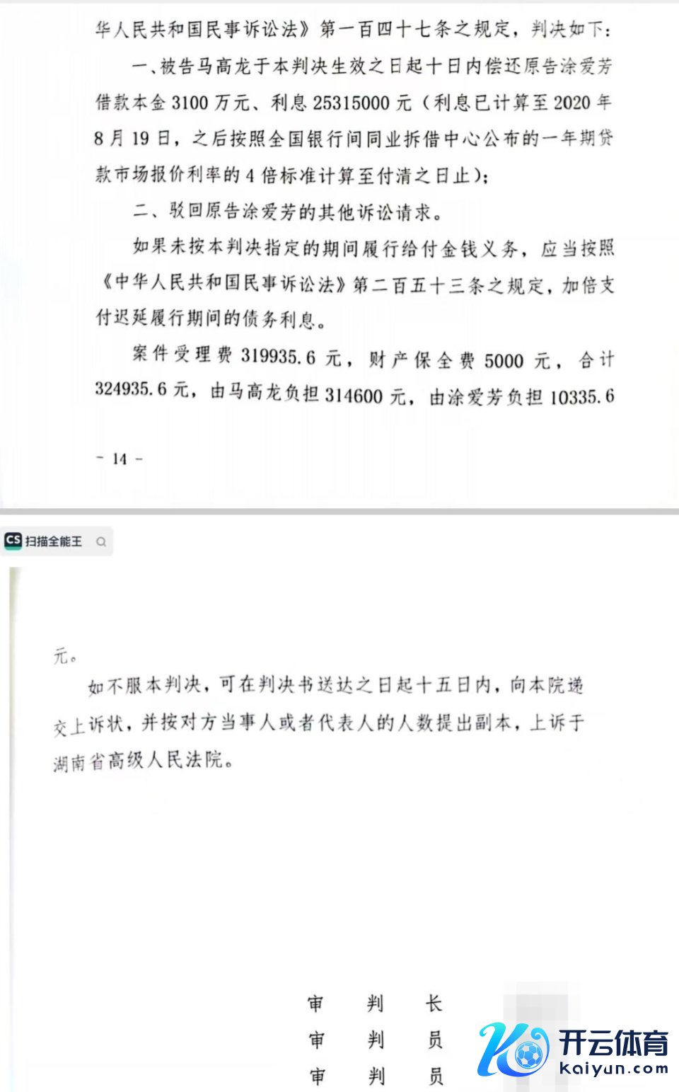 据此,2022年8月17日,长沙市中级东说念主民法院出具的(2022)湘01民初25号《民事判决书》判处马高龙偿还涂爱芳借款本金3100万元、利息25315000元。同期,驳回涂爱芳其他诉讼请求。马高龙对此判决抵御,向湖南省高档东说念主民法院拿起上诉。