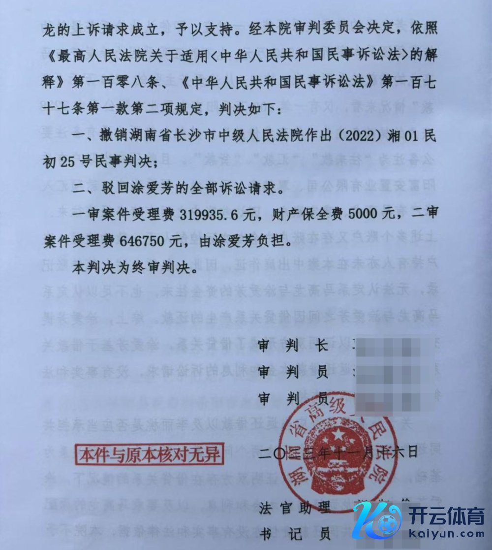 涂爱芳抵御湖南省高档东说念主民法院作出的(2022)湘民终394号民事判决,本年9月,她向最妙手民法院恳求再审并获立案审查。末端现在kaiyun官方网站,最妙手民法院尚未就此案决定再审或驳回再审恳求。